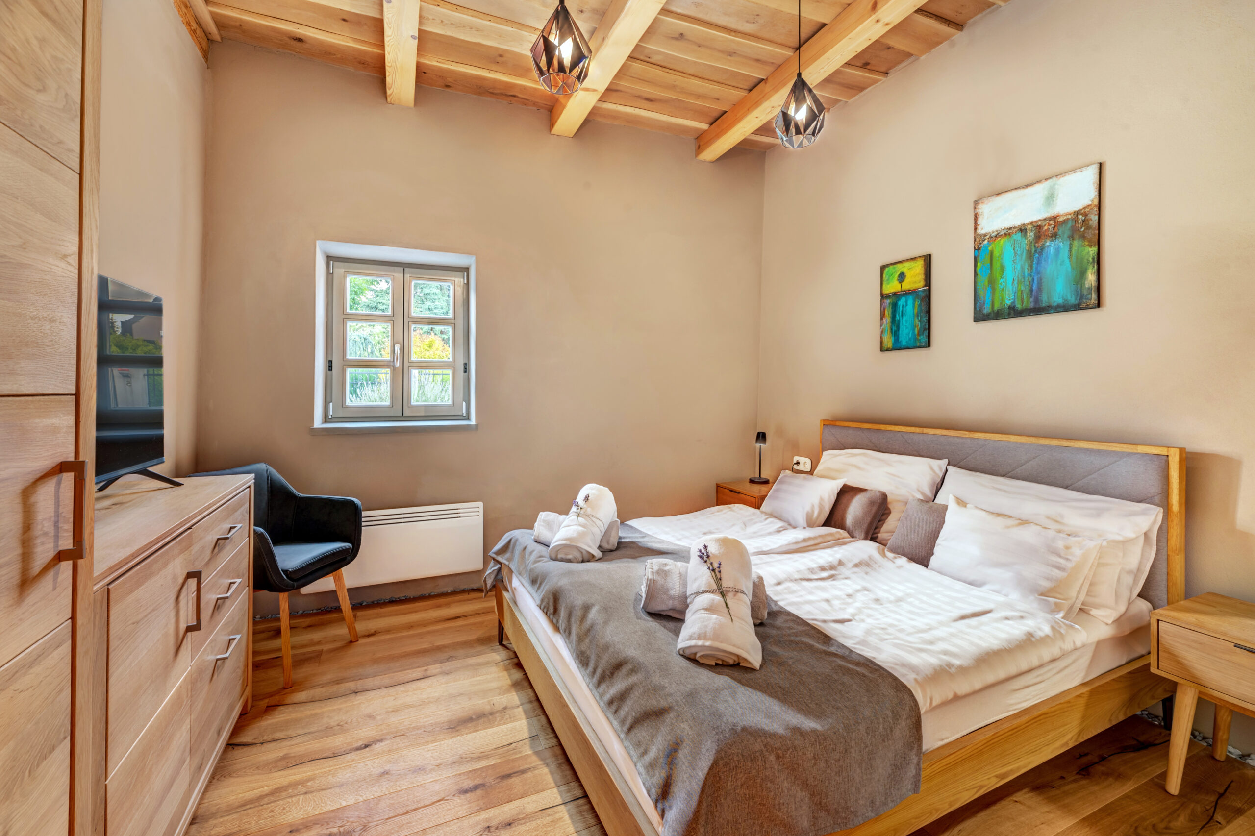 A kétszintes ház 12 + 4 fő kényelmes befogadására alkalmas. A földszinten két tágas, 4 fős lakosztály és a wellness részleg kapott helyet, míg az emeleten a közösségi terek, a konyha, két kétszemélyes hálószoba és egy galéria biztosítja az otthonos, mégis exkluzív hangulatot.