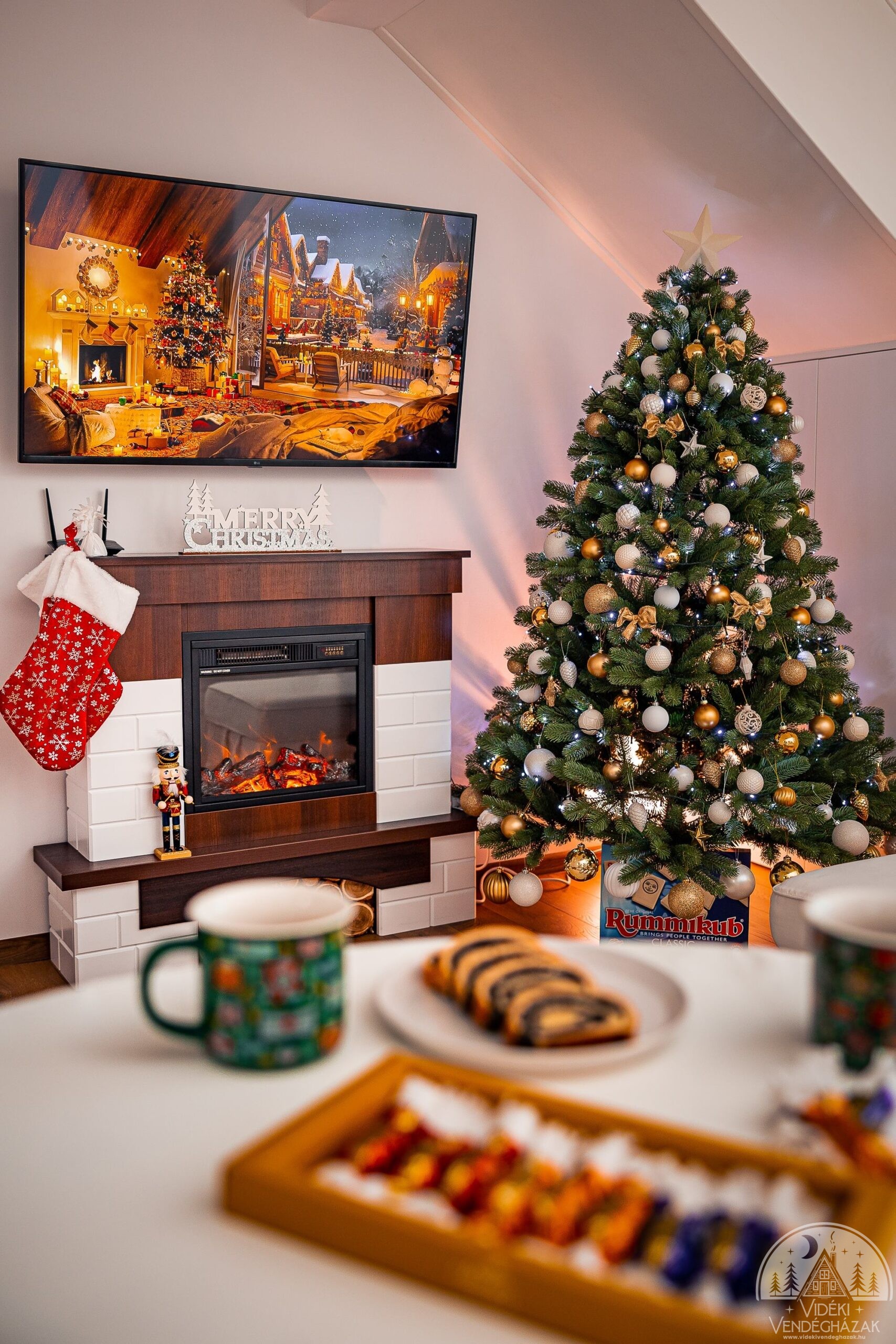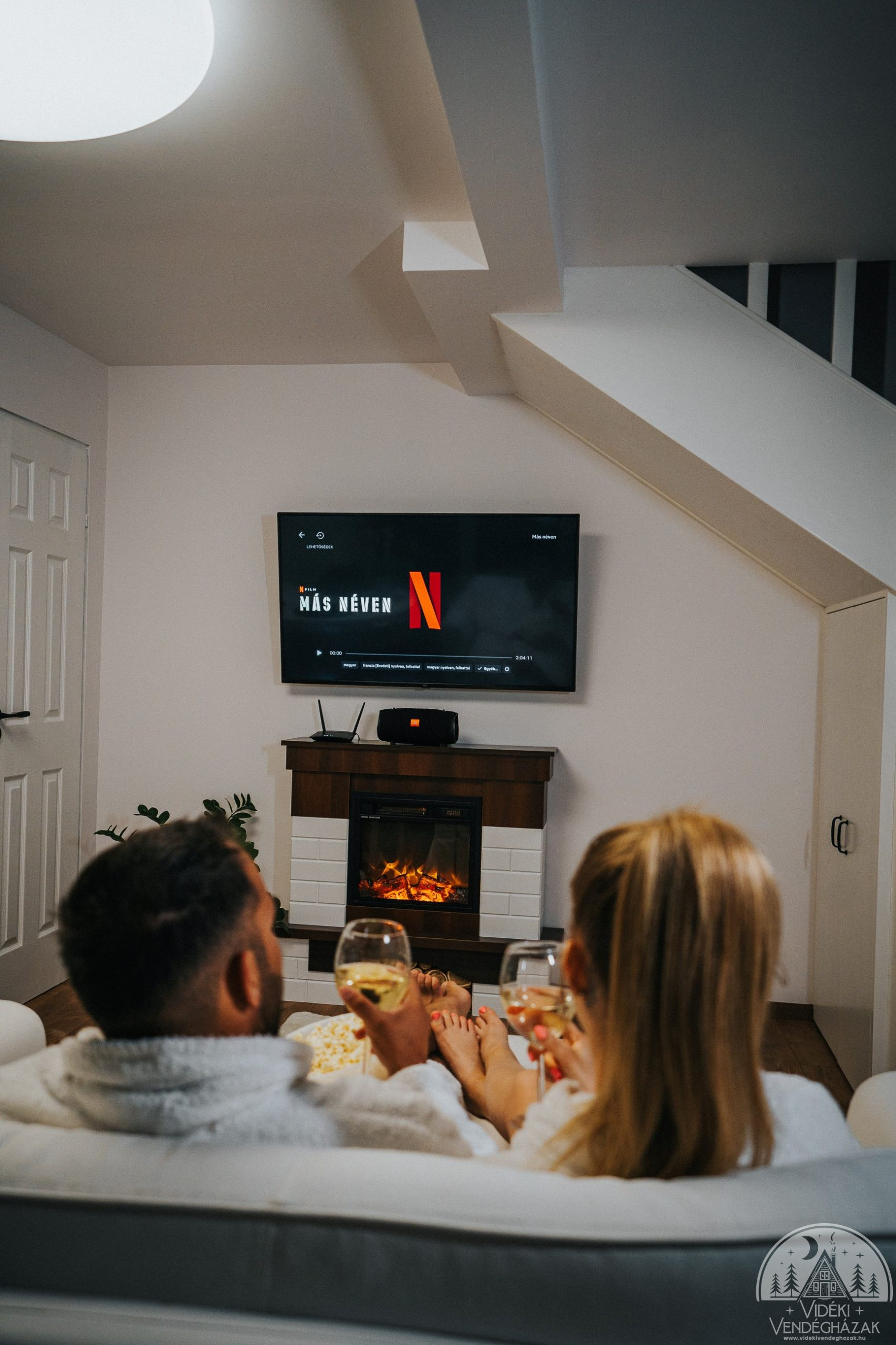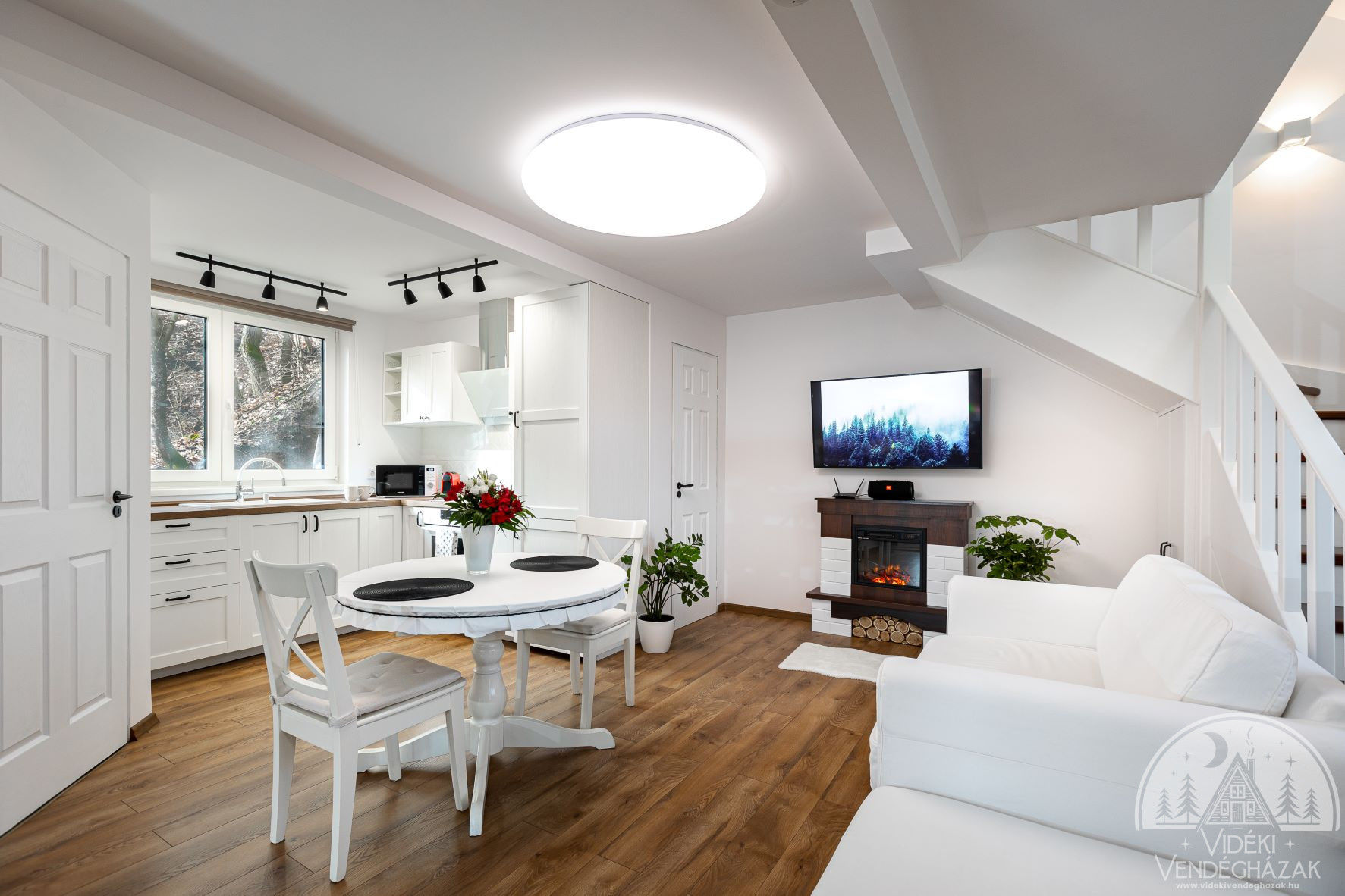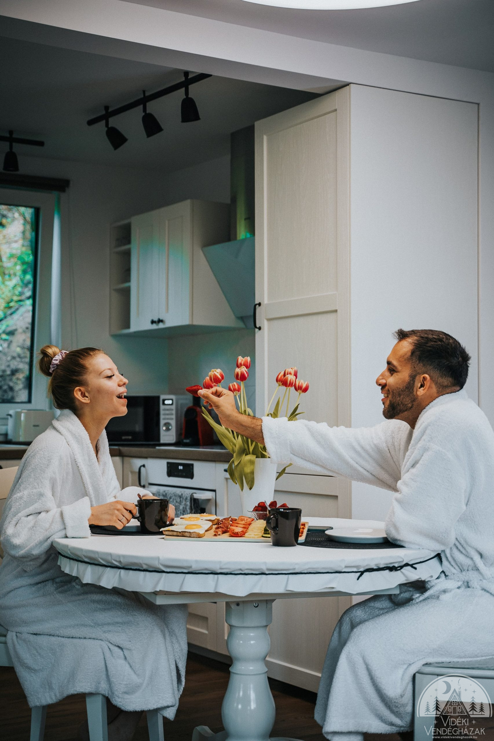 - konyha: mosogatógép, vízforraló, kenyérpirító, hűtő, indukciós főzőlap edényekkel, páraelszívó, mikrohullámú sütő, Nespresso kávéfőző, tányérok, poharak, evőeszközök, alapvető fűszerek,tea és kávé bekészítés.