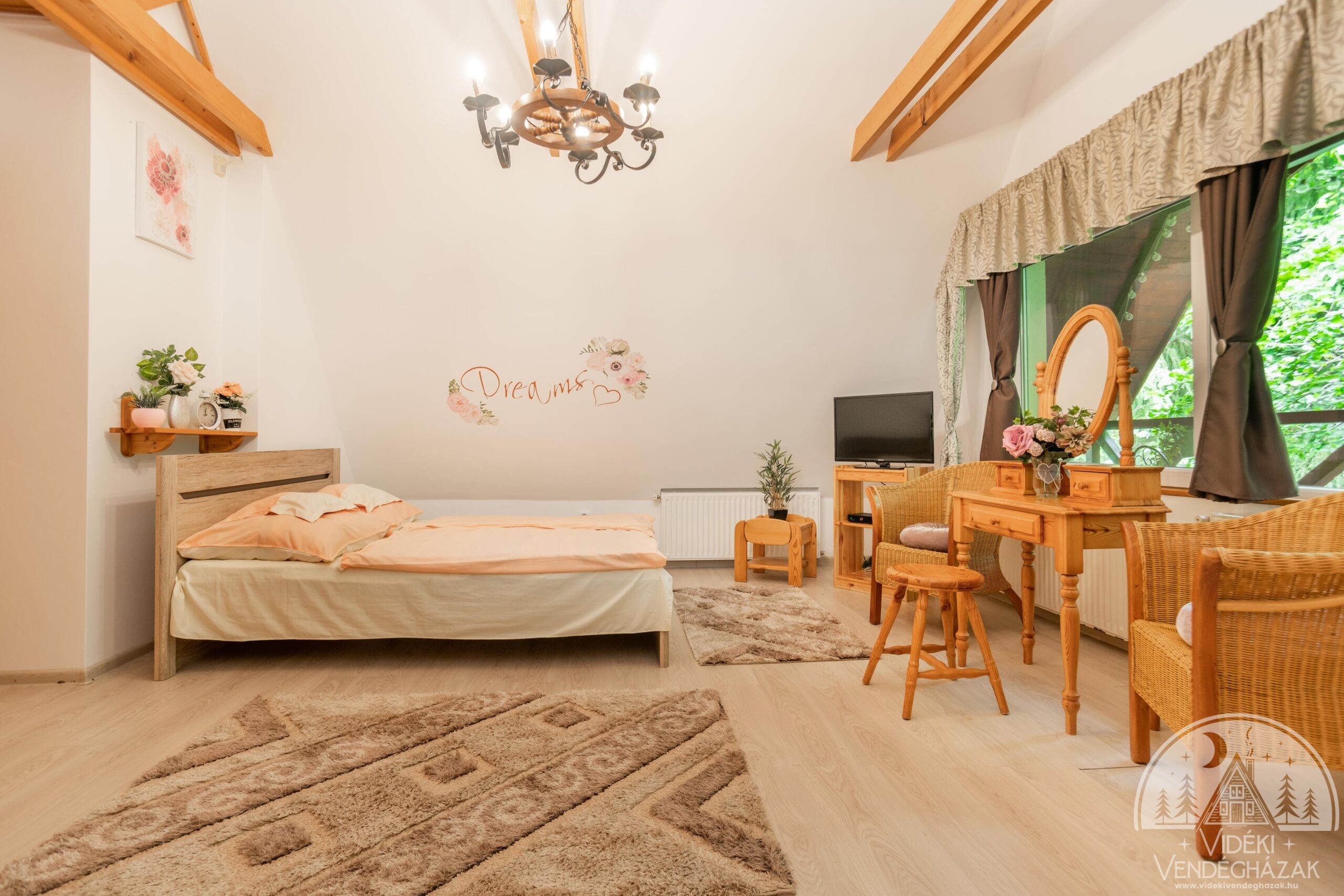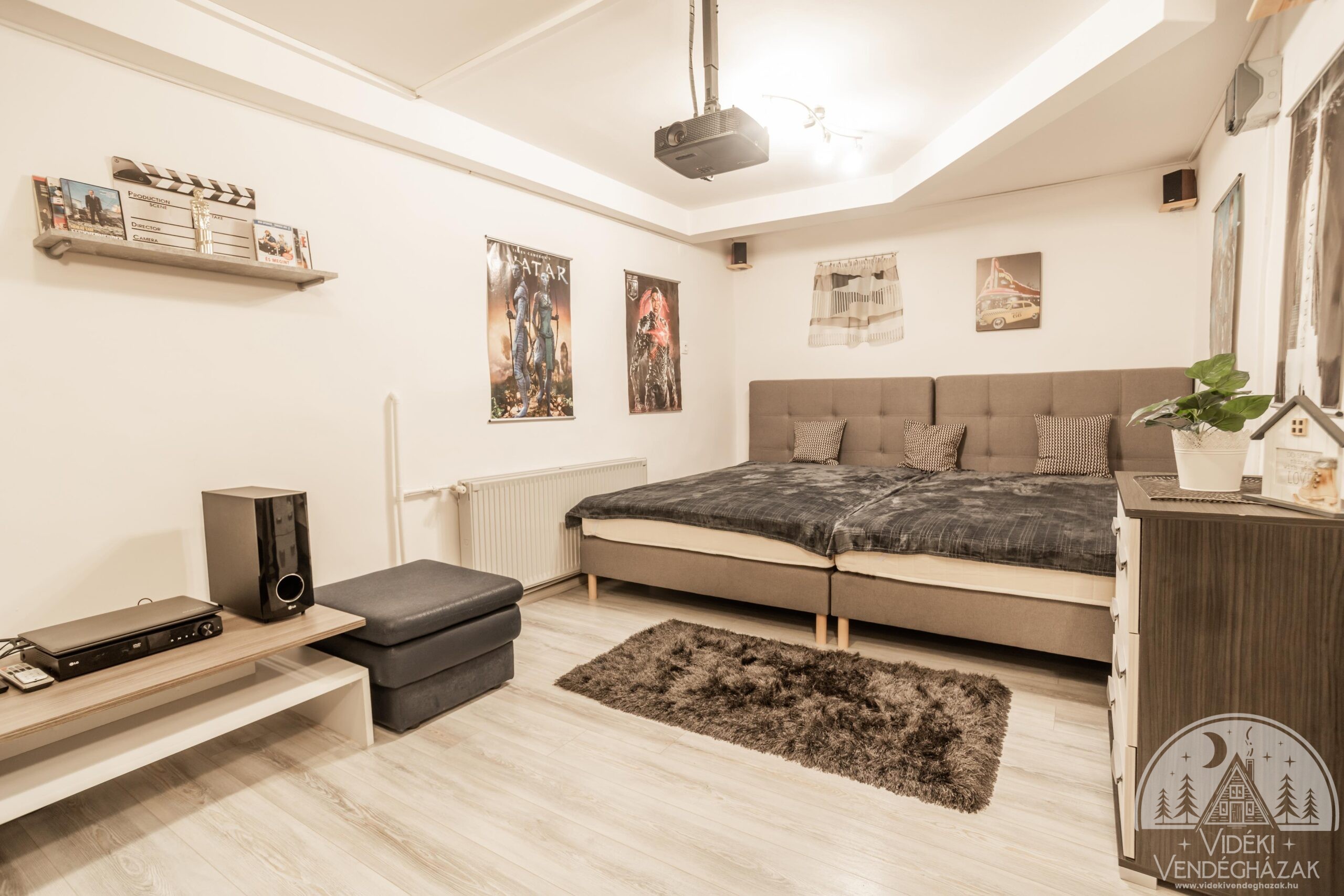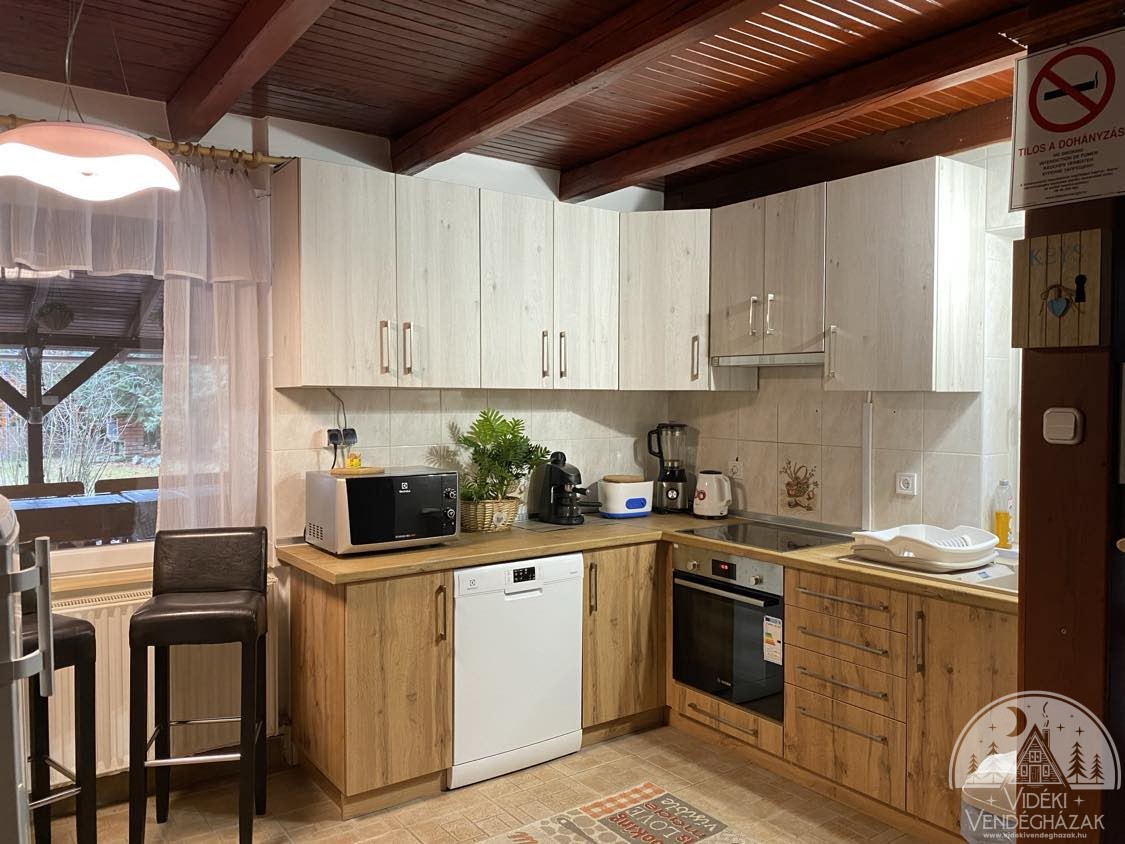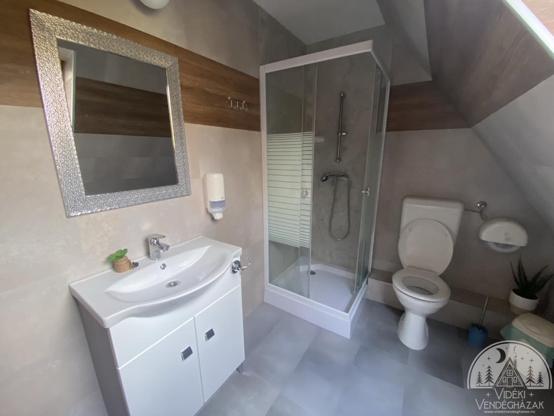 berendezett szoba áll a vendégek részére, 3 fürdőszobával, két szinten. A hangulatos
