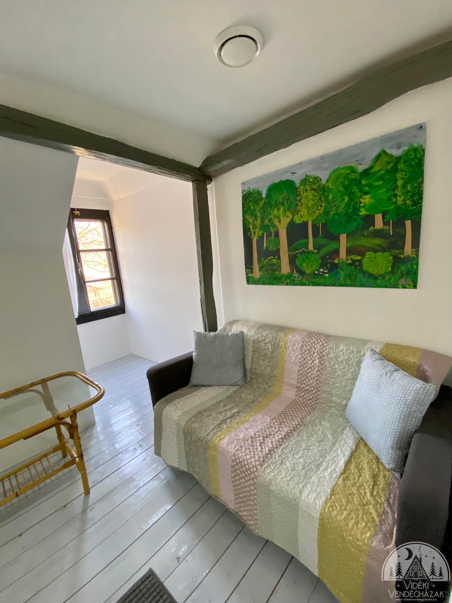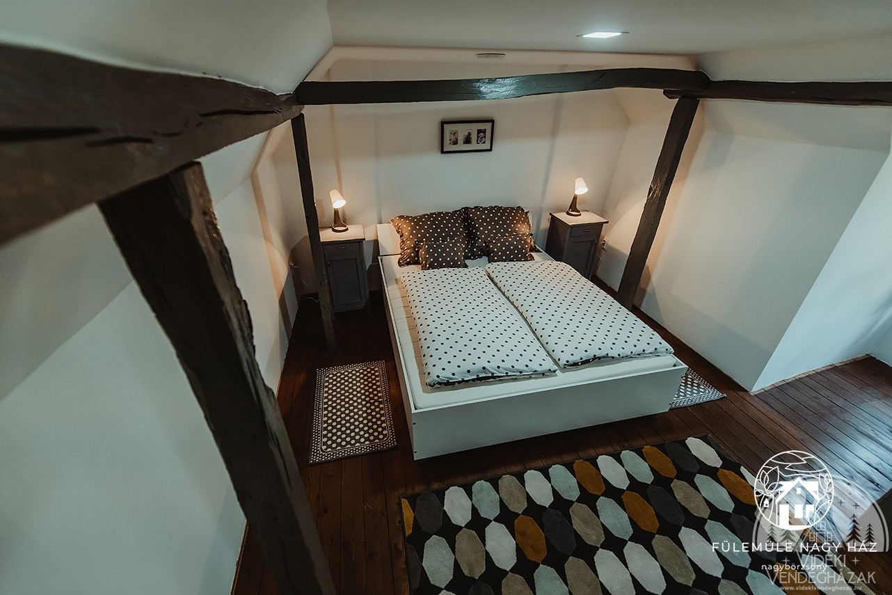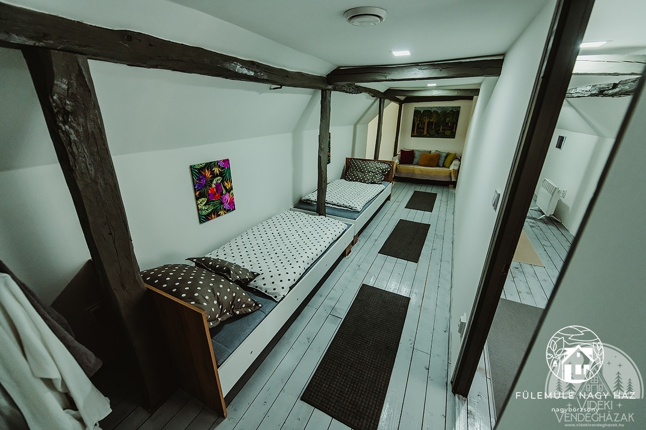 Az emeleten három külön bejáratú szoba van: egy franciaágyas szoba (2 fő), egy családi szoba – franciaágy + kihúzható ágy (2+2 személy), egy 3 személyes szoba – három egyszemélyes ágy (3 fő).