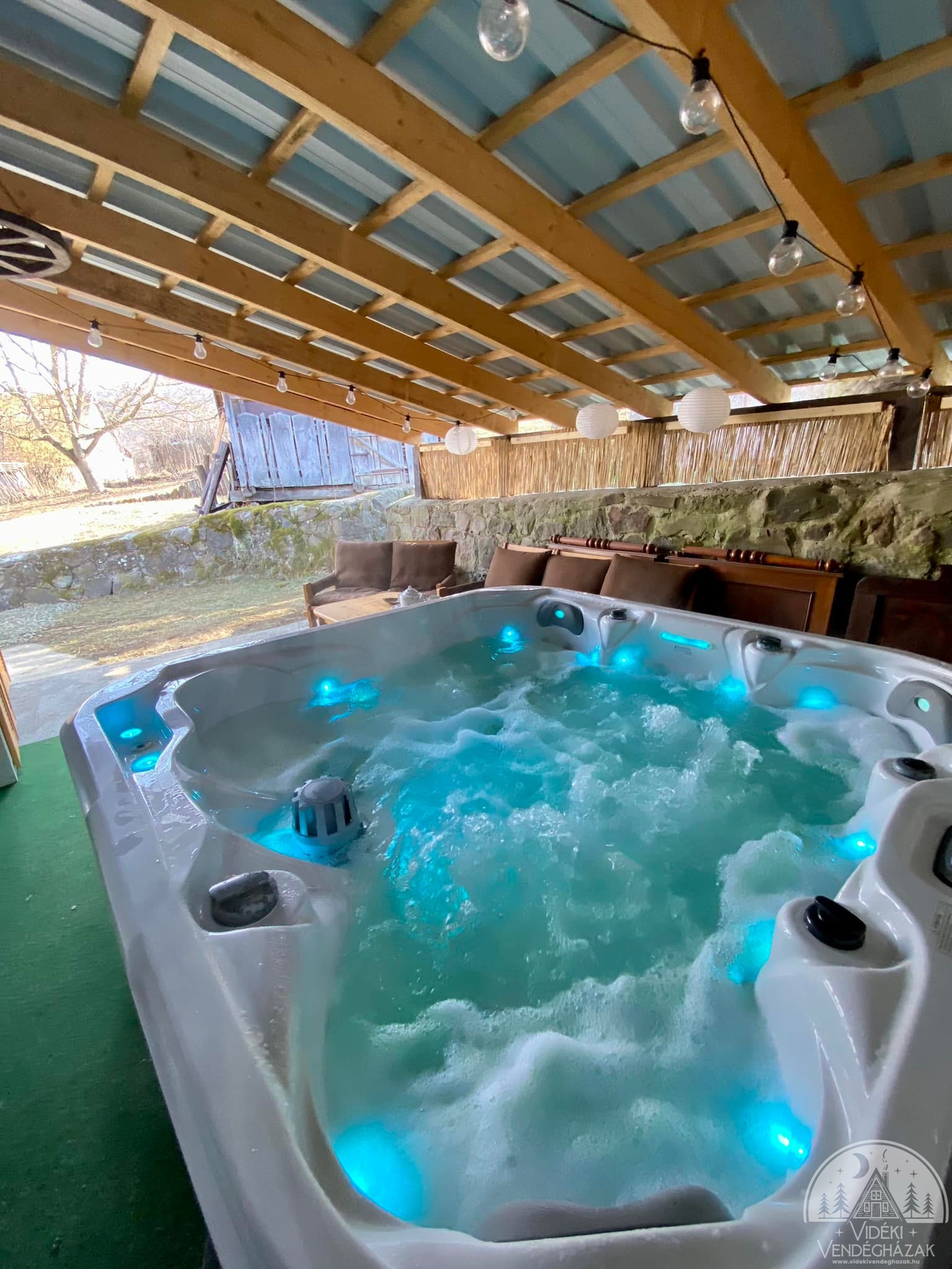 A kertben egy fedett térben van a 4 fős jakuzzi, így bármikor, bármilyen időjárás esetén tudjátok használni.