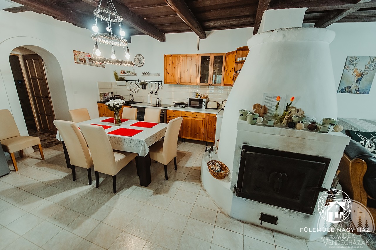 földszinten van egy franciaágyas szoba 2 fő részére, a nappali, az étkező kemencével – teljes felszereltségű konyhával (főzőlap, légkeveréses sütő, mosogatógép, kávé, teafőző) 2 fürdőszoba (egyik sarokkádas, másik zuhanyzós és 2 db külön bejáratú WC).