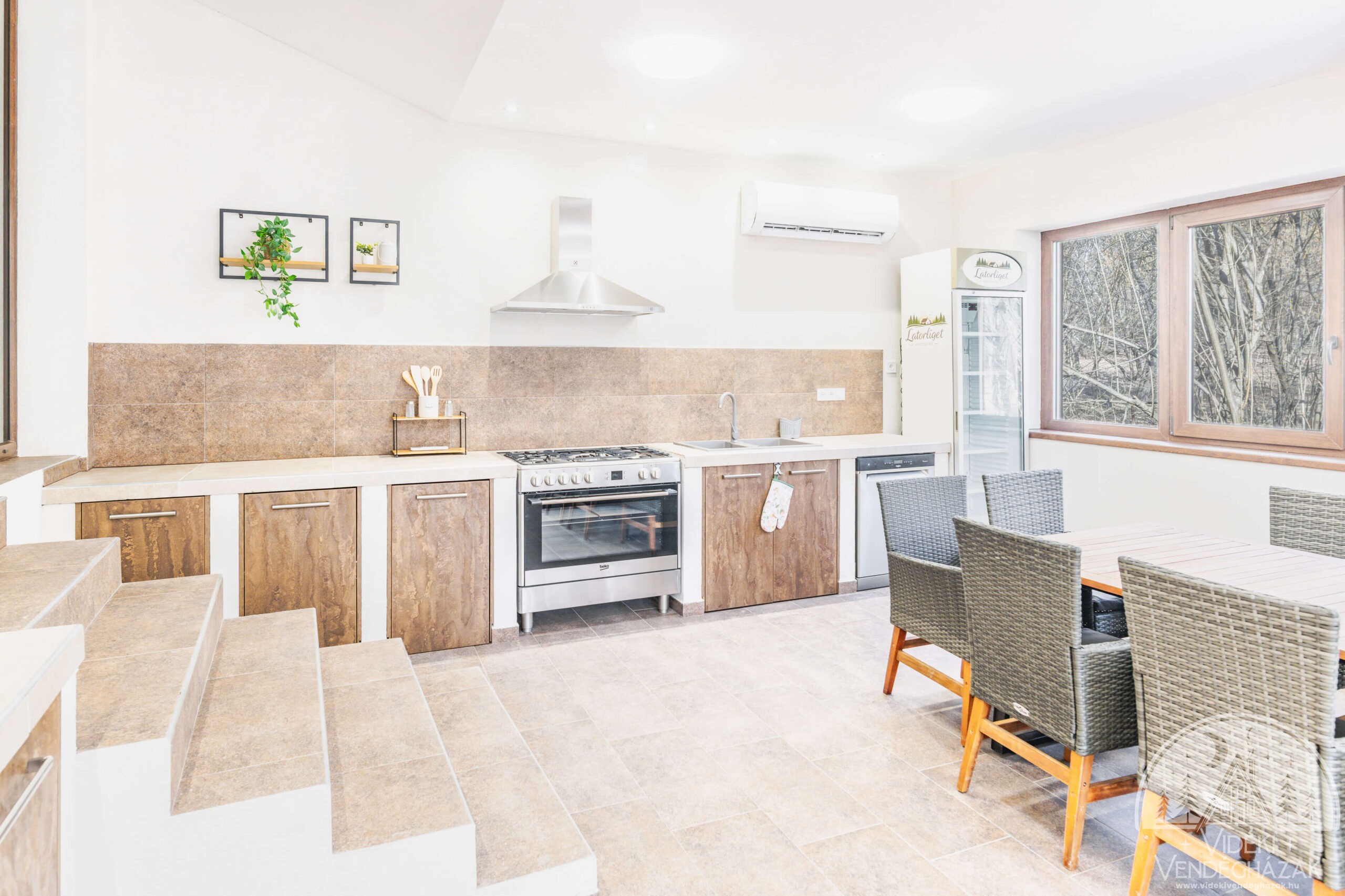 Az 50 négyzetméteres, zárt, klimatizált és fűthető kerti konyha hatalmas ablakaival szinte beengedi az erdőt a térbe. Itt nem csak főzni lehet – itt együtt alkotni, koccintani, ünnepelni.