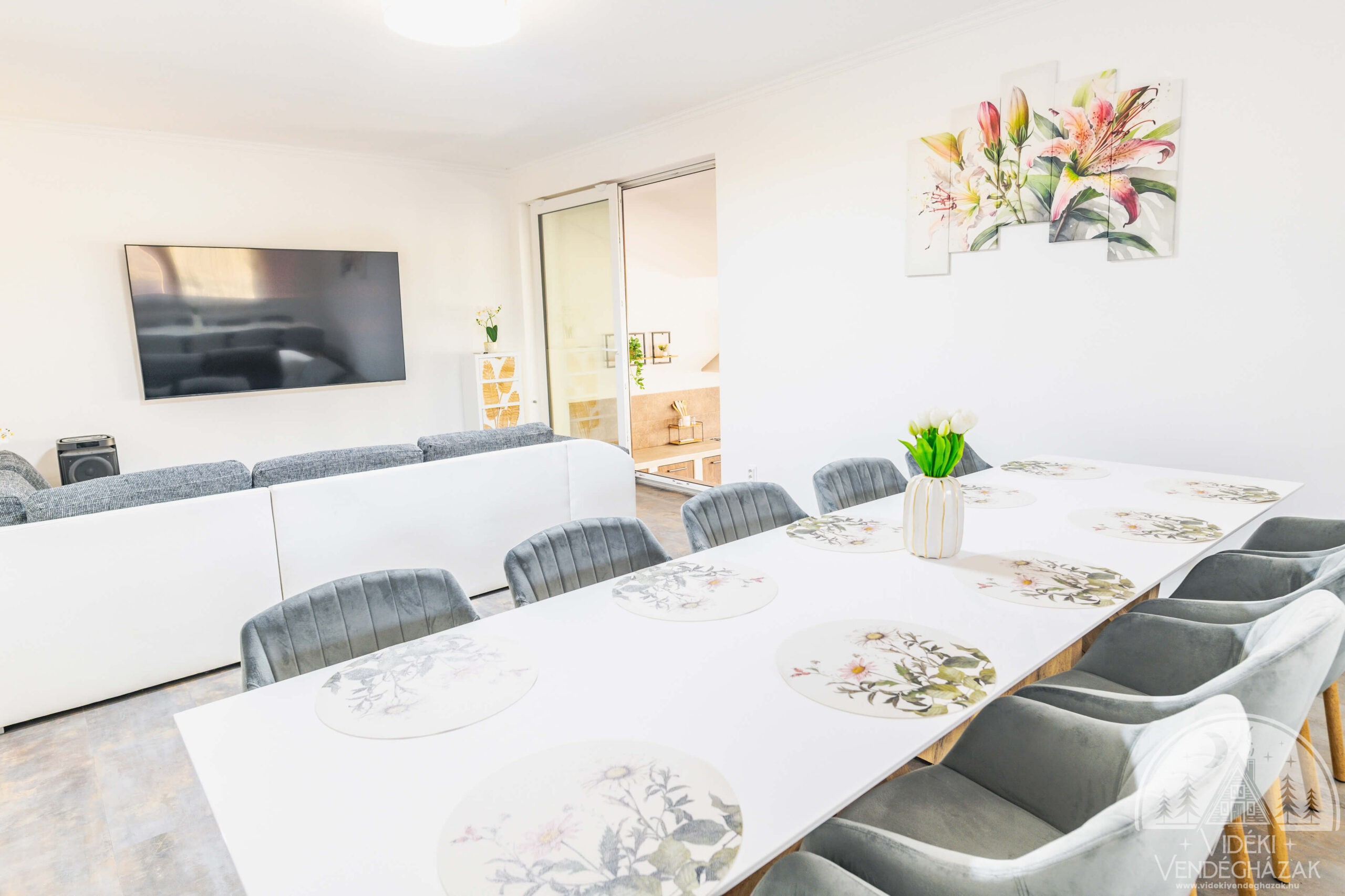 A nappaliban egy óriási LCD TV gondoskodik a közös filmestékről, sportközvetítésekről vagy egy hosszú nap utáni lazításról. Innen közvetlen átjárás nyílik a ház egyik ékkövébe – a kerti konyhába.
