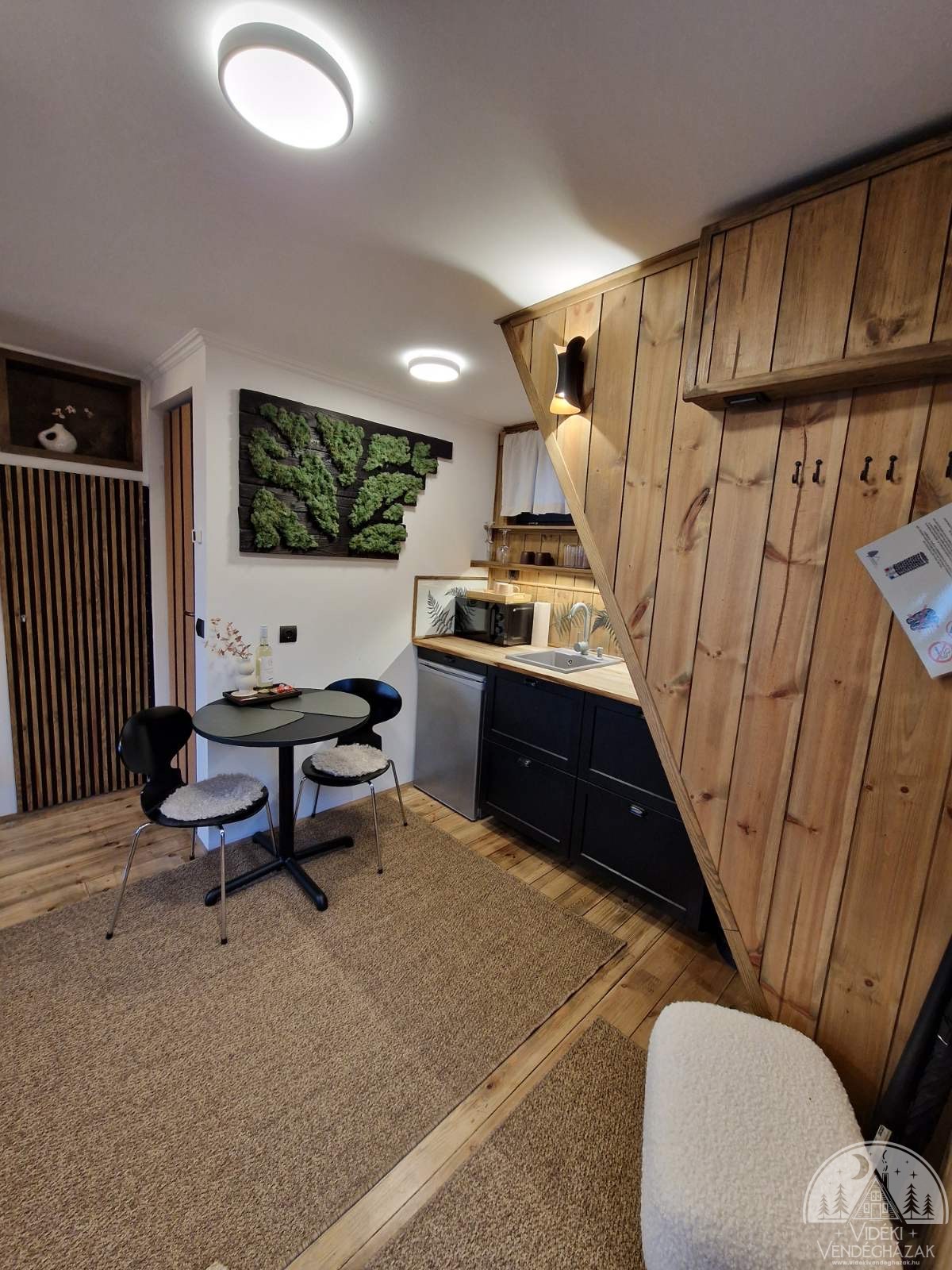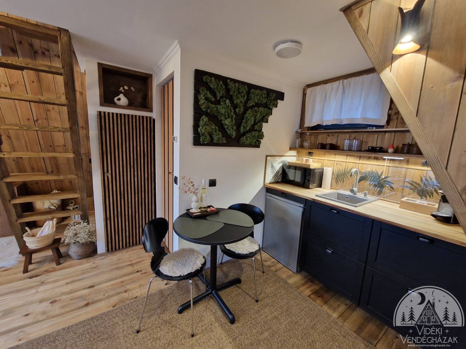• Felszerelt konyha, hűtő, indukciós főzőlap, grillezős mikrohullámú sütő, vízforraló, kenyérpirító, edények, étkészlet