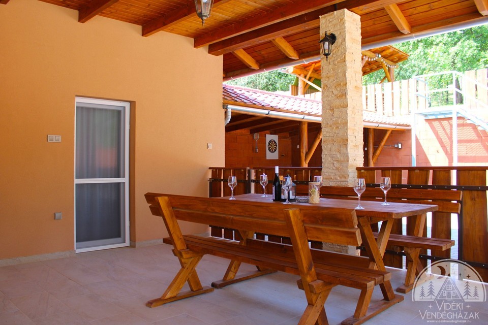 A házhoz tartozik 20m2 fedett terasz, asztallal és padokkal.