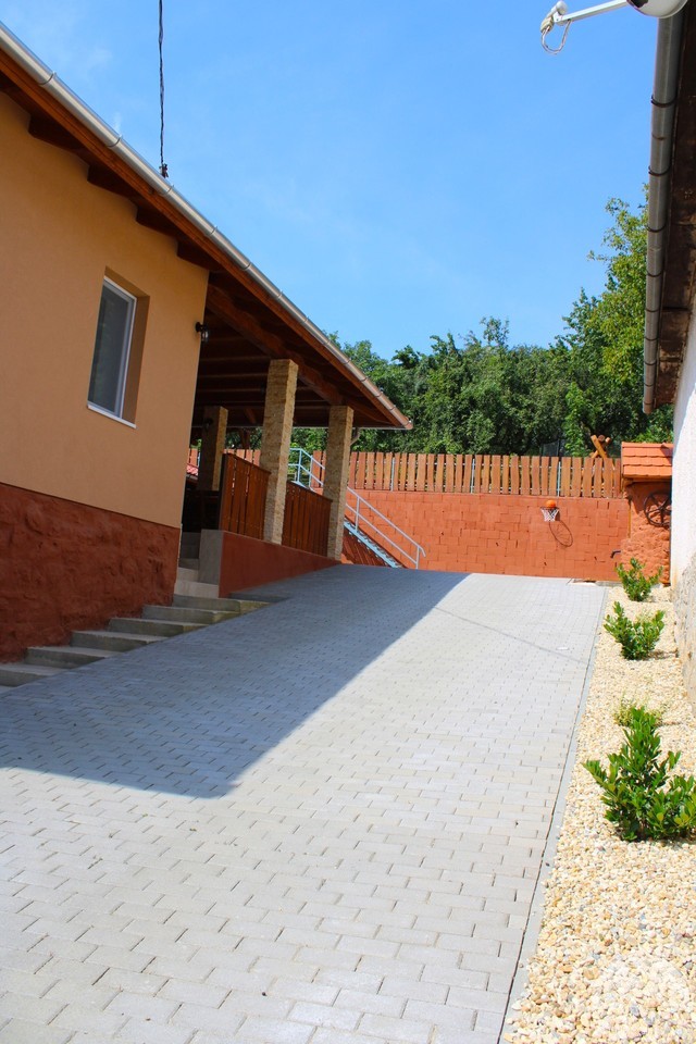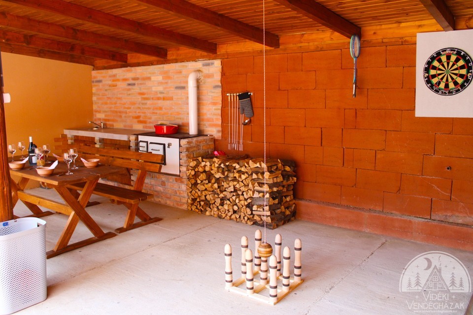 Az udvaron fedett nyári konyha (konyhapult, mosogató, asztal, padok) került kialakításra, ahol lehetőség van sütni,főzni (sparhelten), valamint elhelyeztünk egy darts táblát, és egy lengőtekét is. (Lehetőség van tollas labdázni, valamint elhelyeztünk az udvaron egy kosárgyűrűt kosárlabdával.)
