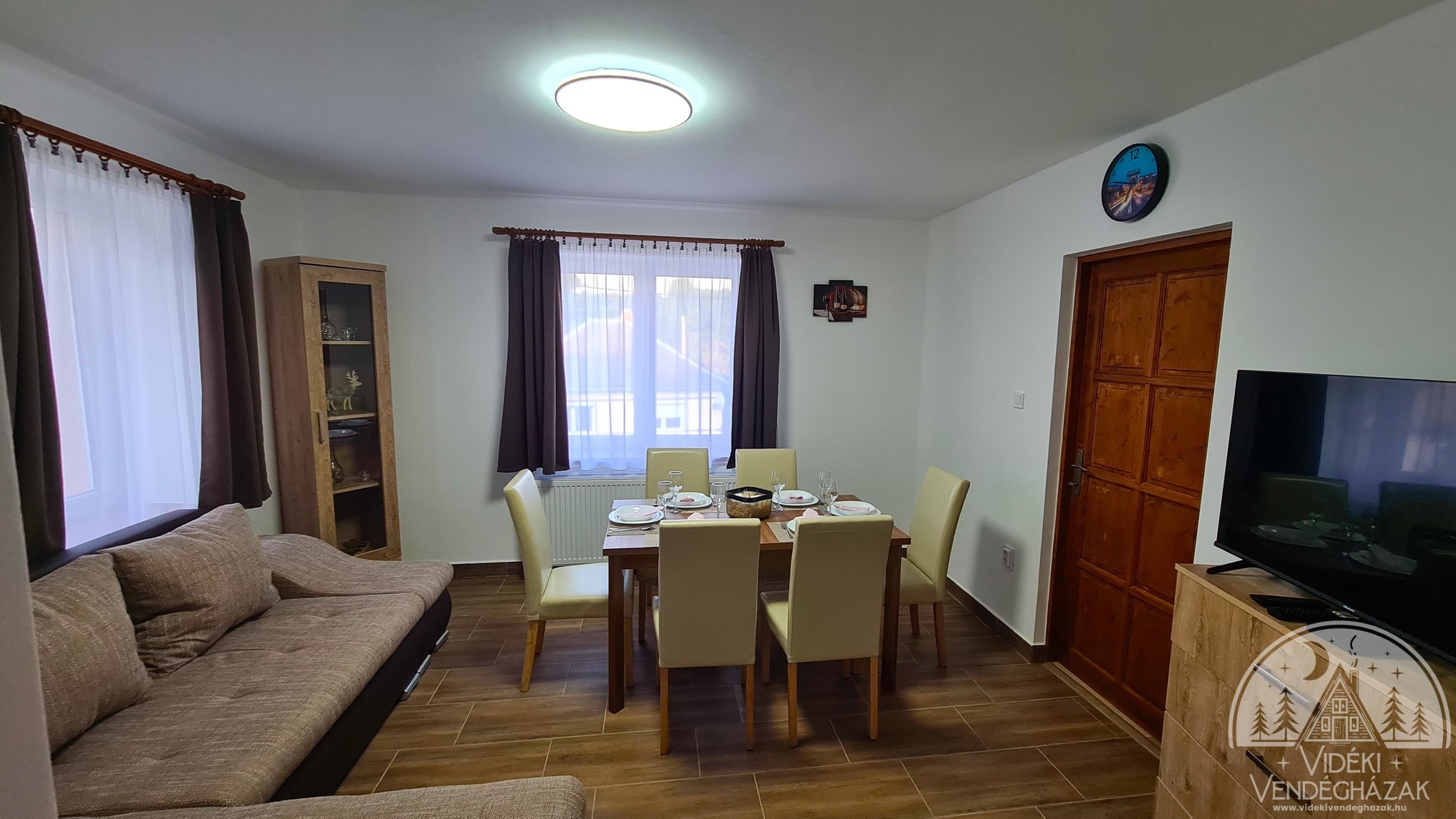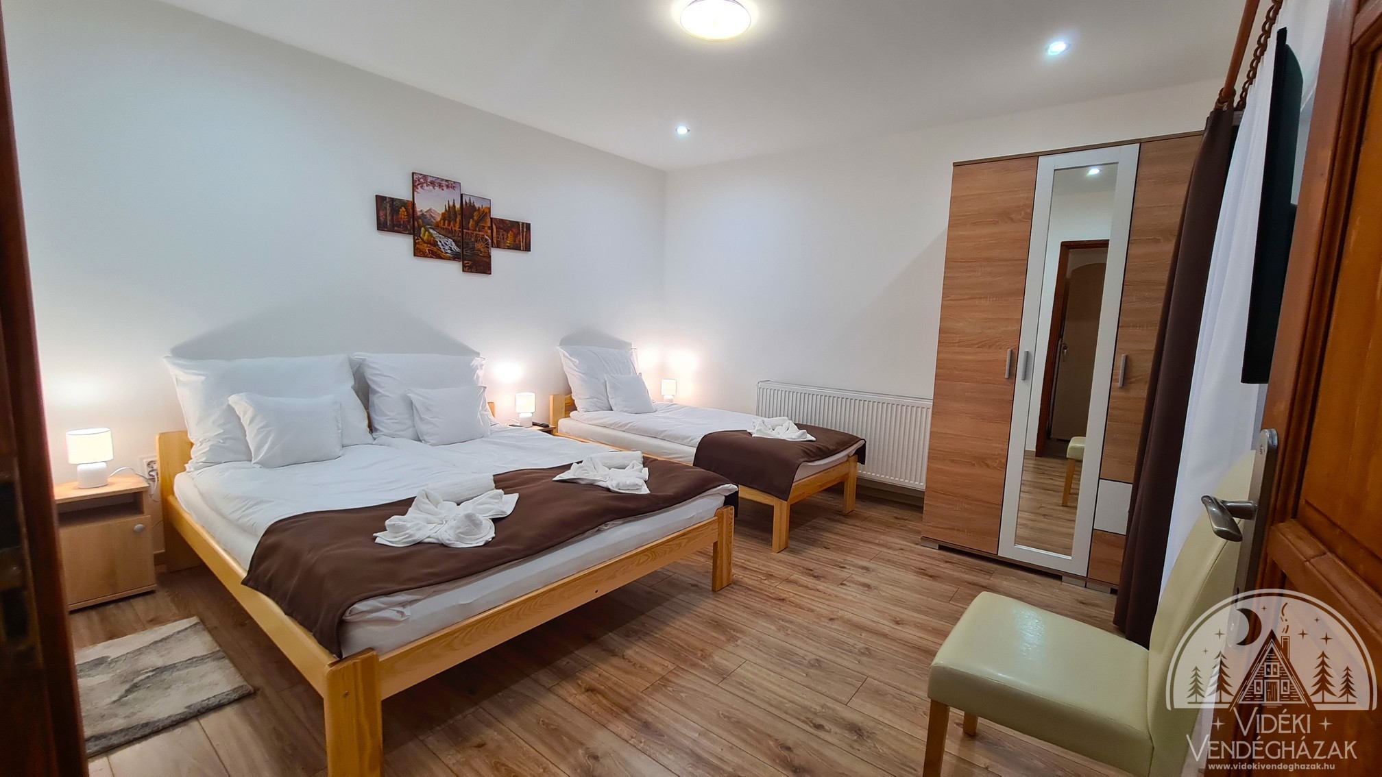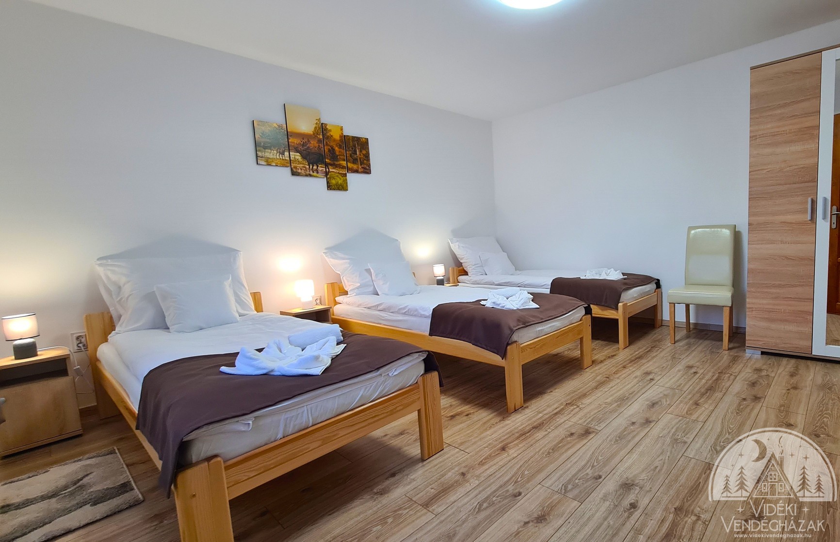 Vendégházunkat 2019. novemberében vásároltuk. 2020. februárjában kezdtük a felújítási munkákat. Az épület teljes körű felújításon ment keresztül. (Vendégházunk előterében ezt képekkel is bemutatjuk.) A vendégházban 2 hálószoba, 1 nappali, 1 konyha és 2 fürdőszoba került kialakításra. Az egyik hálószobában 3db 90cm x 200cm méretű ágy, a másik szobában 1 franciaágy (160cm x 200cm) és 1db 90cm x 200cm méretű ágy került elhelyezésre. Ágyneműt (1 nagypárna, 1 kispárna és 1 paplan) ágyneműhuzattal együtt, 1 nagy méretű törölközőt, 1 kis méretű törölközőt, valamint a fürdőszobákban is kisméretű törölközőket biztosítunk. A két szobában 6 fő elhelyezésére, a nappaliban szükség esetén +2 fő elhelyezésére van lehetőség. (A nappaliból nyílik az egyik hálószoba.)