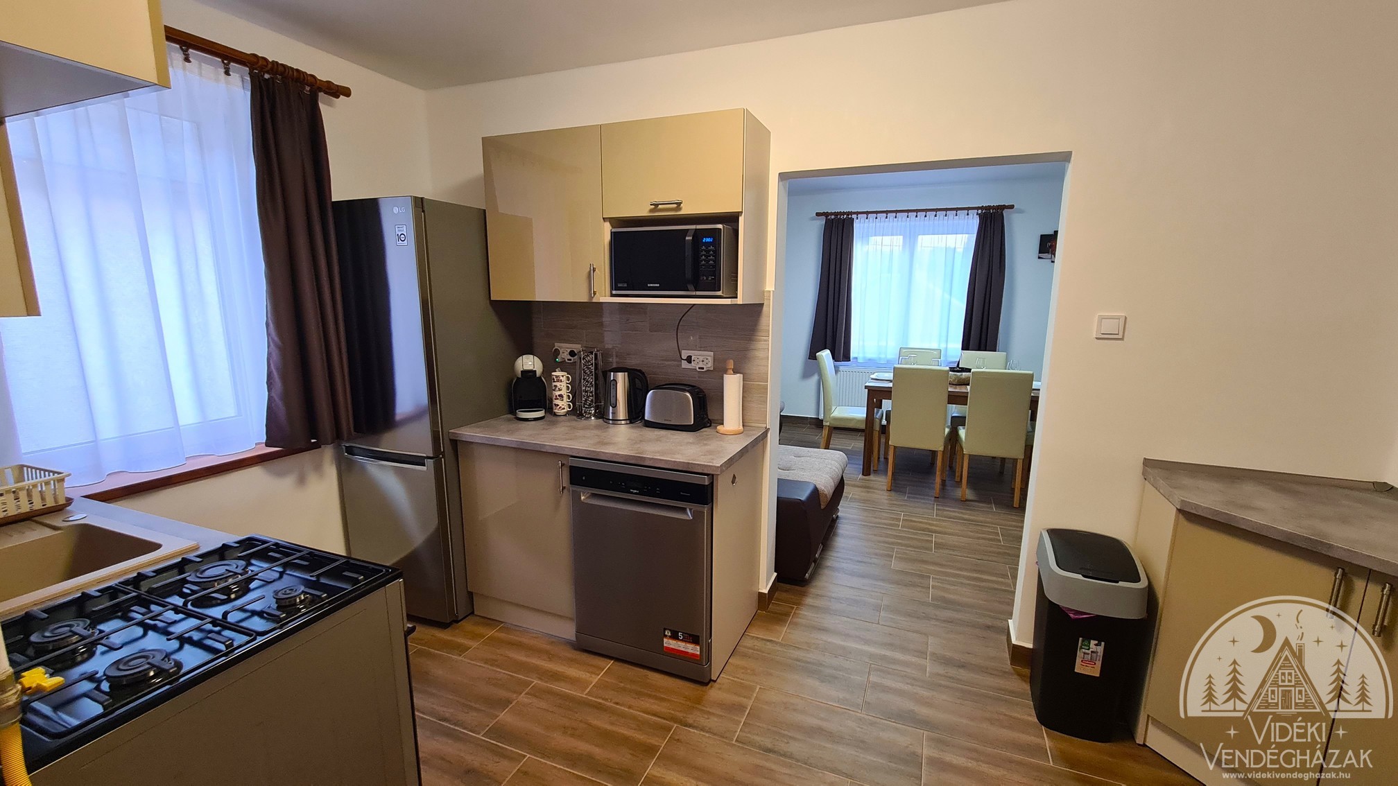 A konyha jól felszerelt. Étkészlet, evőeszköz, főzőedények, hűtő fagyasztóval, vízforraló, mikrohullámúsütő, gáztűzhely, kenyérpirító, dolce gusto kapszulás kávéfőző, mosogatógép. (A kávéfőzőhöz kapszulát biztosítunk (1db/fő))