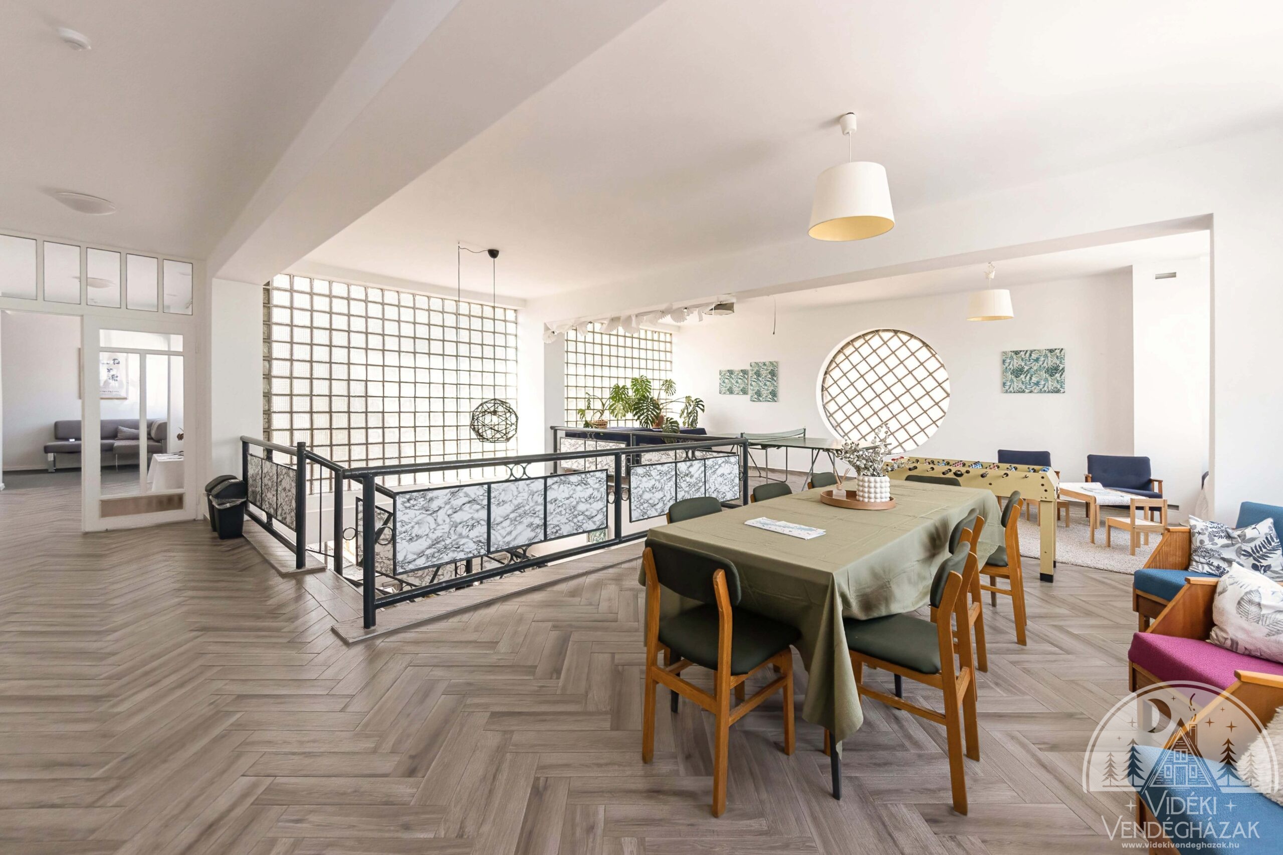 Játéktér ping-pong, csocsó és rex-asztallal az emeleti panorámás közösségi terünkben és teljesen körbezárt kert a szaladgáló gyermekek és kisállatok védelmére