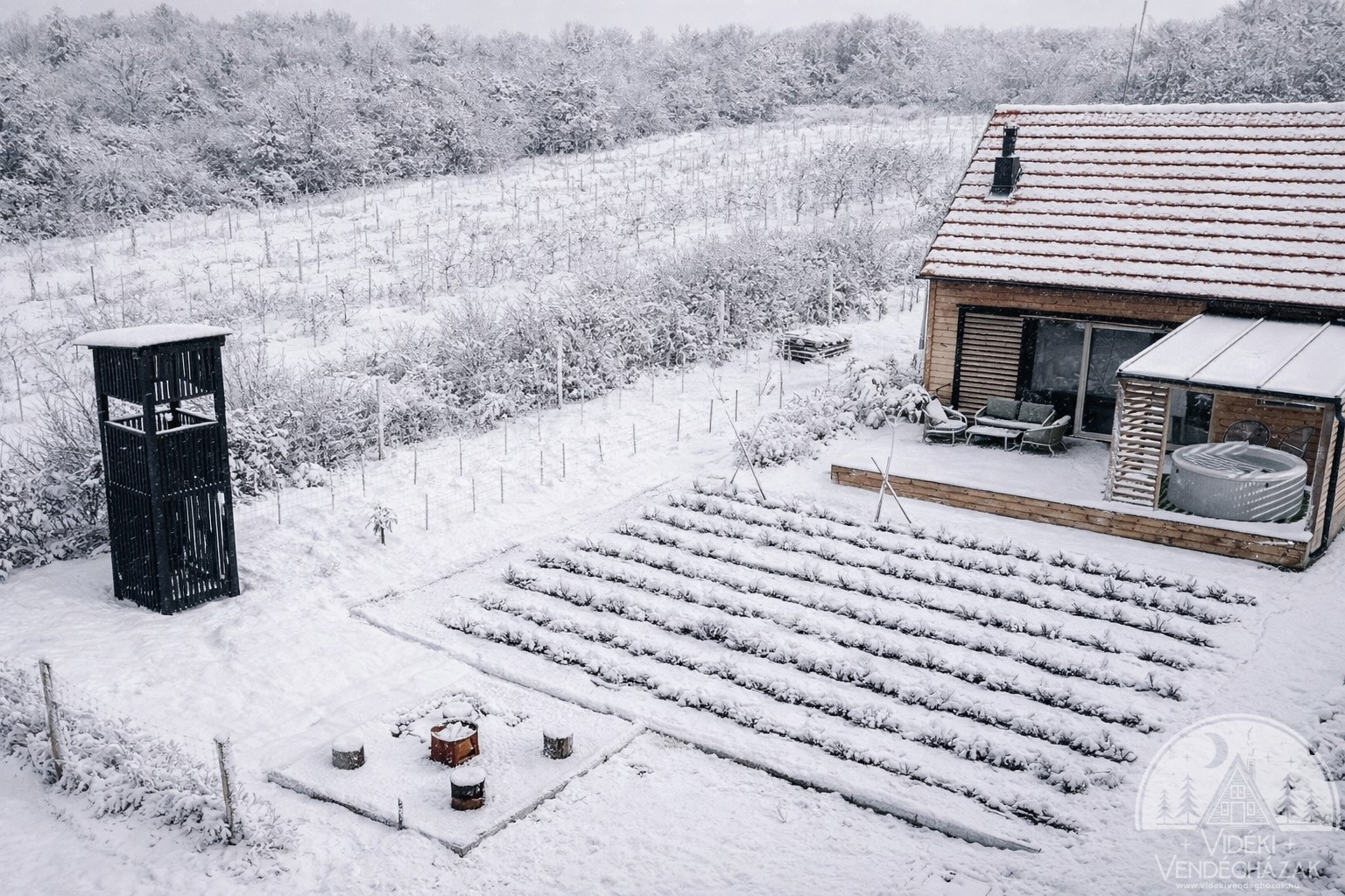 • Privát erdőszéli tér, 1850 m² kert, panoráma terasz